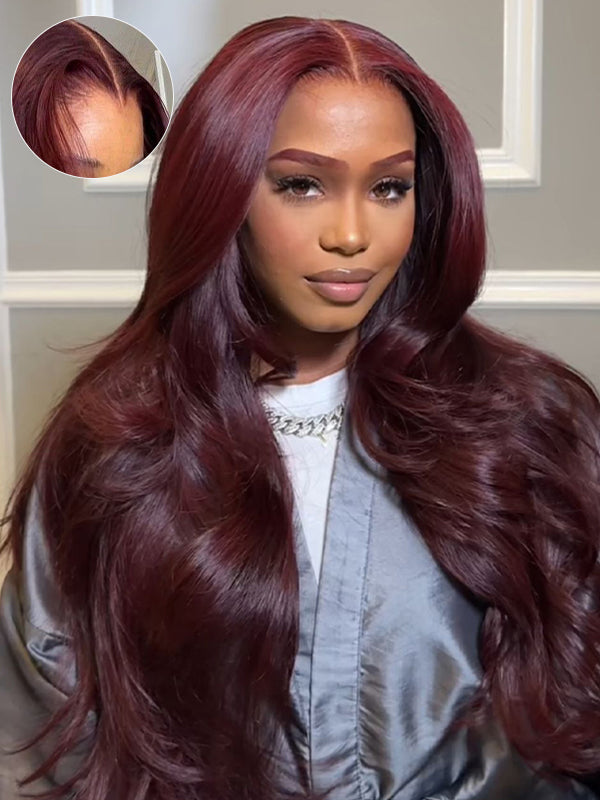 Dark Burgundy Layered Cut Human Hair Wig Wine Salon Styled 13x6 Lace Frontal Wigs Sterly Hair